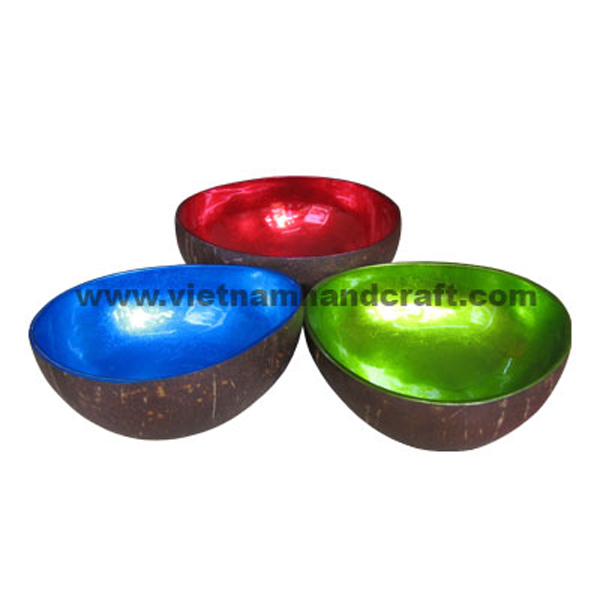 Product name: Lacquered coconut bowl. Inside in silver metallic red, blue & green, outside in natural coconut shell