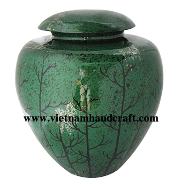 Product name: Green lacquered ceramic cremation urn with hand-painted black trees